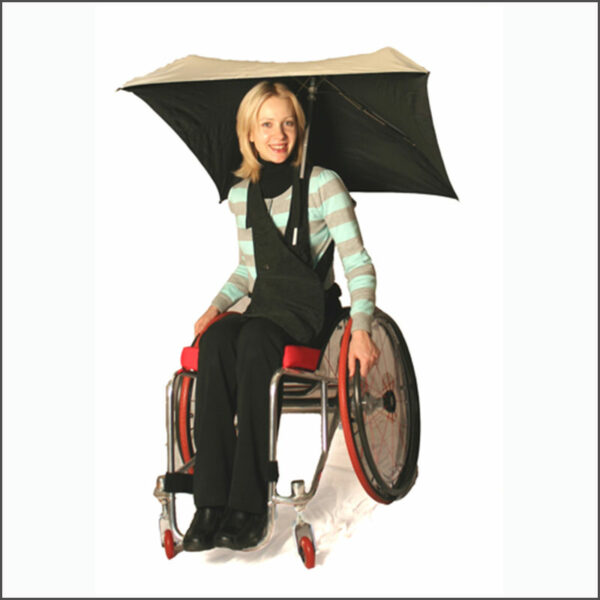 Portaombrello da indossare a tracolla, che ti permette di sostenere l’ombrello aperto mentre piove o anche per ripararti dal sole, lasciando le mani libere per: spingere la sedia a rotelle, guidare lo scooter elettrico, spingere il deambulatore, il passeggino, portare la spesa, ecc.