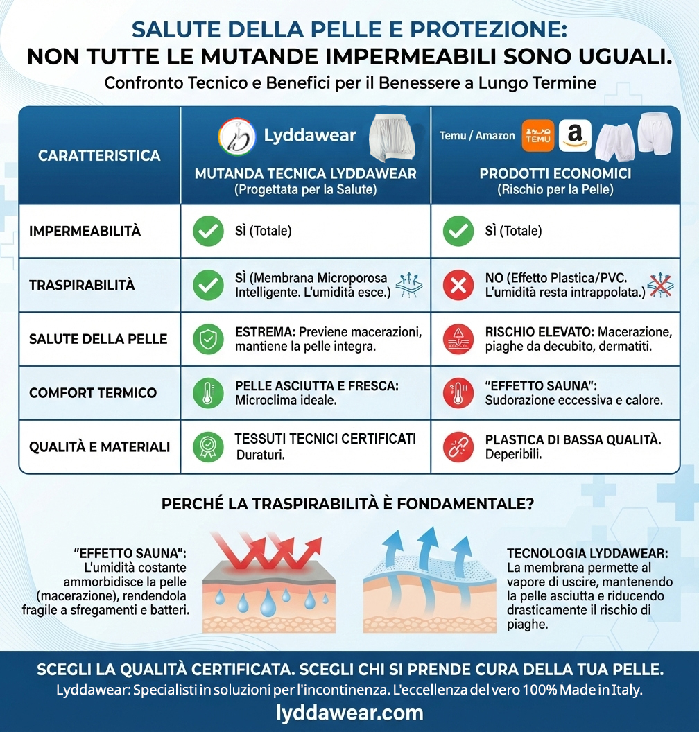Tessuto interno in poliestere con buona impermeabilità, ed esterno in poliuretanto traspirante, compatibilmente con il pannolone utilizzato.